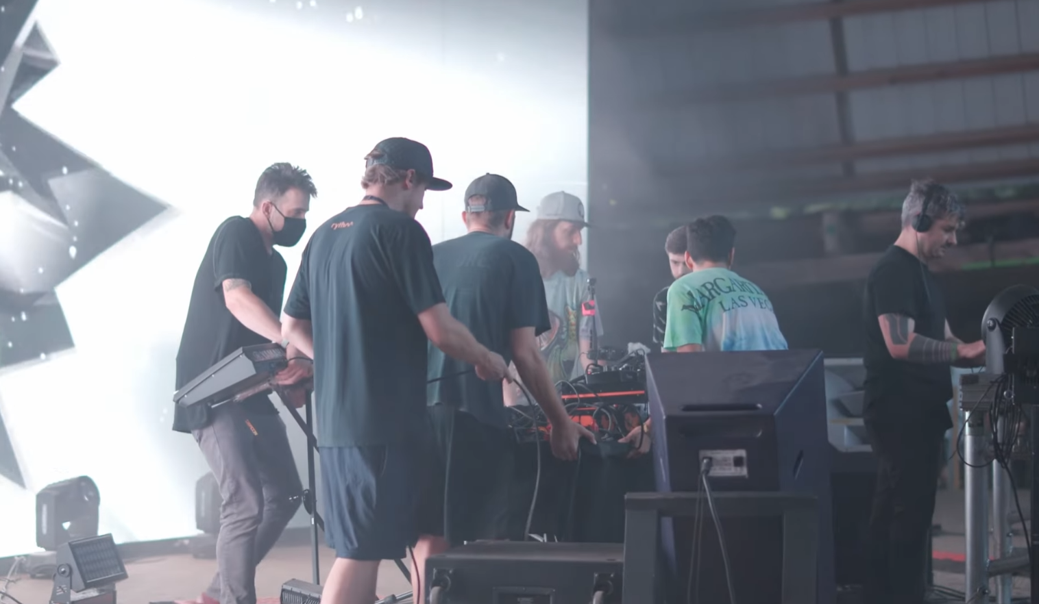 A team of 5 people carrying my gear on a stage designed for a DJ